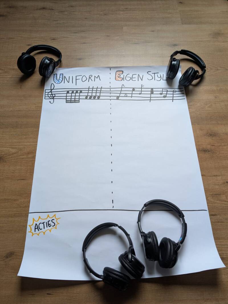 ๐ฌ Deel na de drie nummers de inzichten met elkaar en bespreek hoe jullie in de ideale situatie muziek willen maken (lees: willen samenwerken). Welke elementen vragen uniformiteit? En waar is ruimte voor eigen stijl? Noteer de elementen op post-its en plak ze op de flap